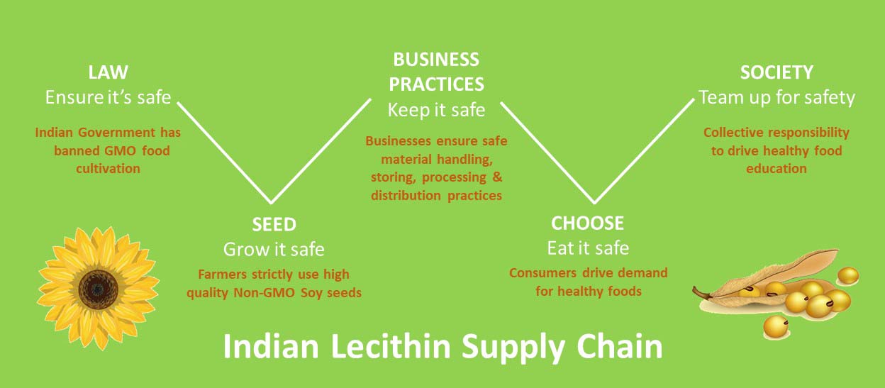 In the typical Supply Chain of Indian Lecithin,ruling out Non-GMO is a crucial part of contributing to healthy food habits in the society. From the Government to the farmers to oil crushers, lecithin extractors, food distributors and makers to finally the mindful customers, all contribute in their own way by ensuring we as an industry always bring out the best products in the market.